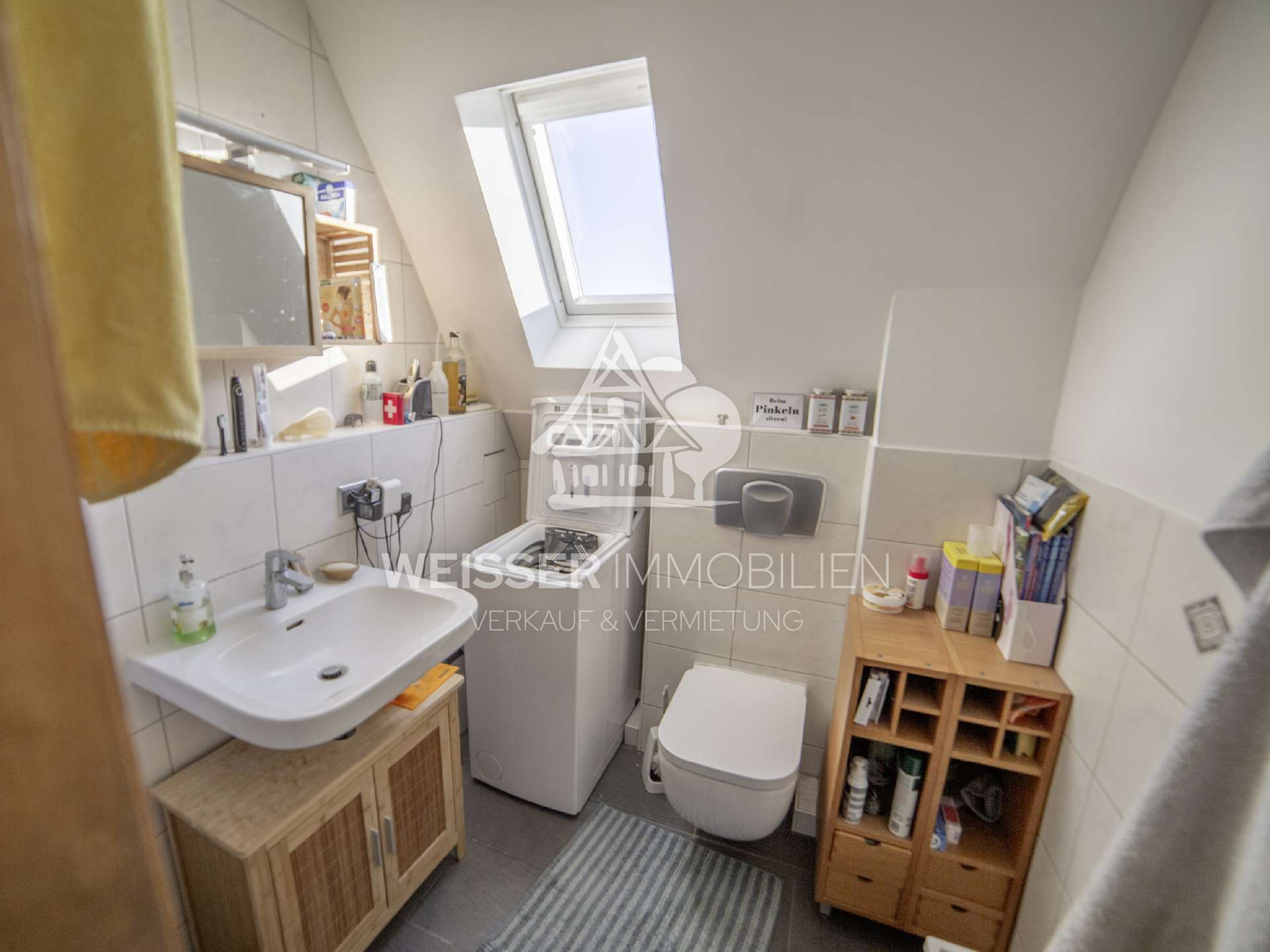 Das geflieste Tageslichtbad verfügt über ein Waschbecken, ein WC, eine Dusche mit neuer Duschwand und einen Waschmaschinenanschluss.